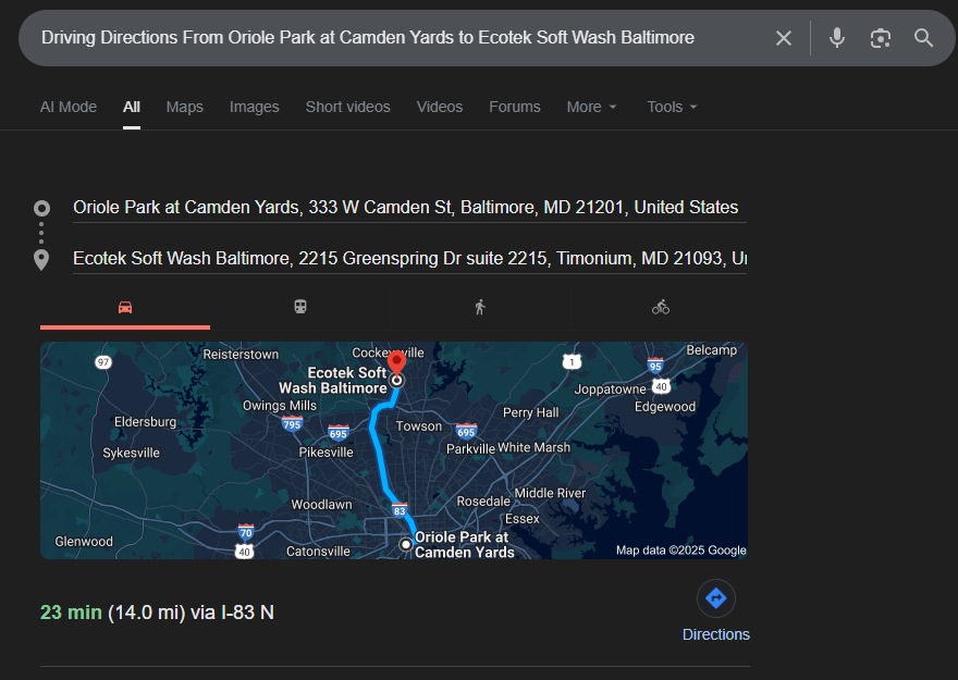 Driving Directions From Oriole Park at Camden Yards to Ecotek Soft Wash Baltimore
