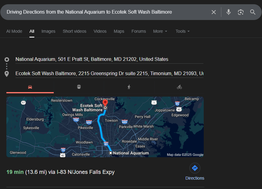 The drive usually takes 22 to 25 minutes, depending on traffic conditions. This makes Ecotek Soft Wash Baltimore conveniently accessible for residents near the Inner Harbor, downtown Baltimore, and surrounding neighborhoods.